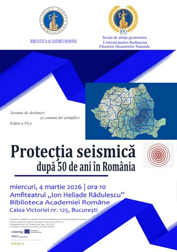 Aflată la a VI-a ediție, Sesiunea de dezbateri și comunicări ştiinţifice Protecția seismică după 50 de ani în România se desfășoară cu sprijinul Proiectului Strengthening and Promoting Earthquake Emergency Response and Rescue Capacity in the Black Sea Basin Area (SPEER-A), Programul Interreg NEXT Bazinul Mării Negre, 2021-2027, Coordonator: Institutul de Geografie al Academiei Române.