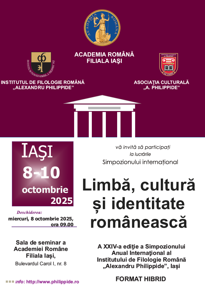 Institutul de Filologie Română „Alexandru Philippide” al Academiei Române, în colaborare cu Asociaţia Culturală „A. Philippide”, organizează cea de a XXIV-a ediție a simpozionului anual internațional al institutului intitulat „Limbă, cultură și identitate românească”.