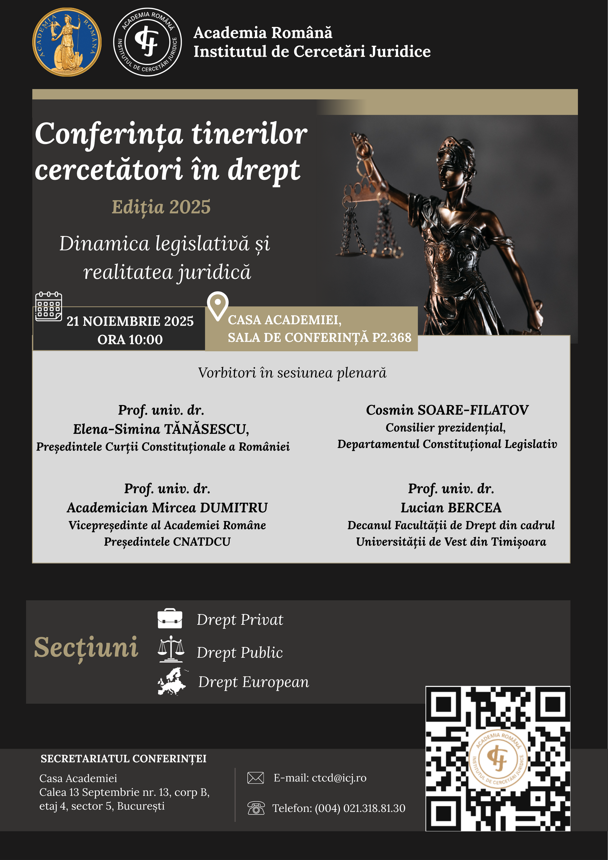 Institutul de Cercetări Juridice „Acad.Andrei Rădulescu” al Academiei Române organizează vineri, 21 noiembrie 2025, prima ediție a Conferinței anuale a tinerilor cercetători în drept. Manifestarea are ca temă „Dinamica legislativă și realitatea juridică” și se va desfășura la sediul institutului (Calea 13 Septembrie nr. 13) cu începere de la ora 10.