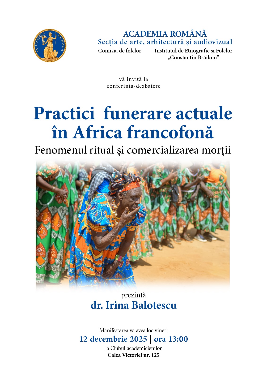 Institutul de Etnografie și Folclor „Constantin Brăiloiu“ al Academiei Române organizează vineri, 12 decembrie 2025, conferința-dezbatere cu tema „Practici funerare actuale în Africa francofonă. Fenomenul ritual și comercializarea morții”, susținută de cercetător științific dr. Irina Balotescu. Evenimentul va avea loc în Clubul Academicienilor din Calea Victoriei nr. 125, începând cu ora 13.