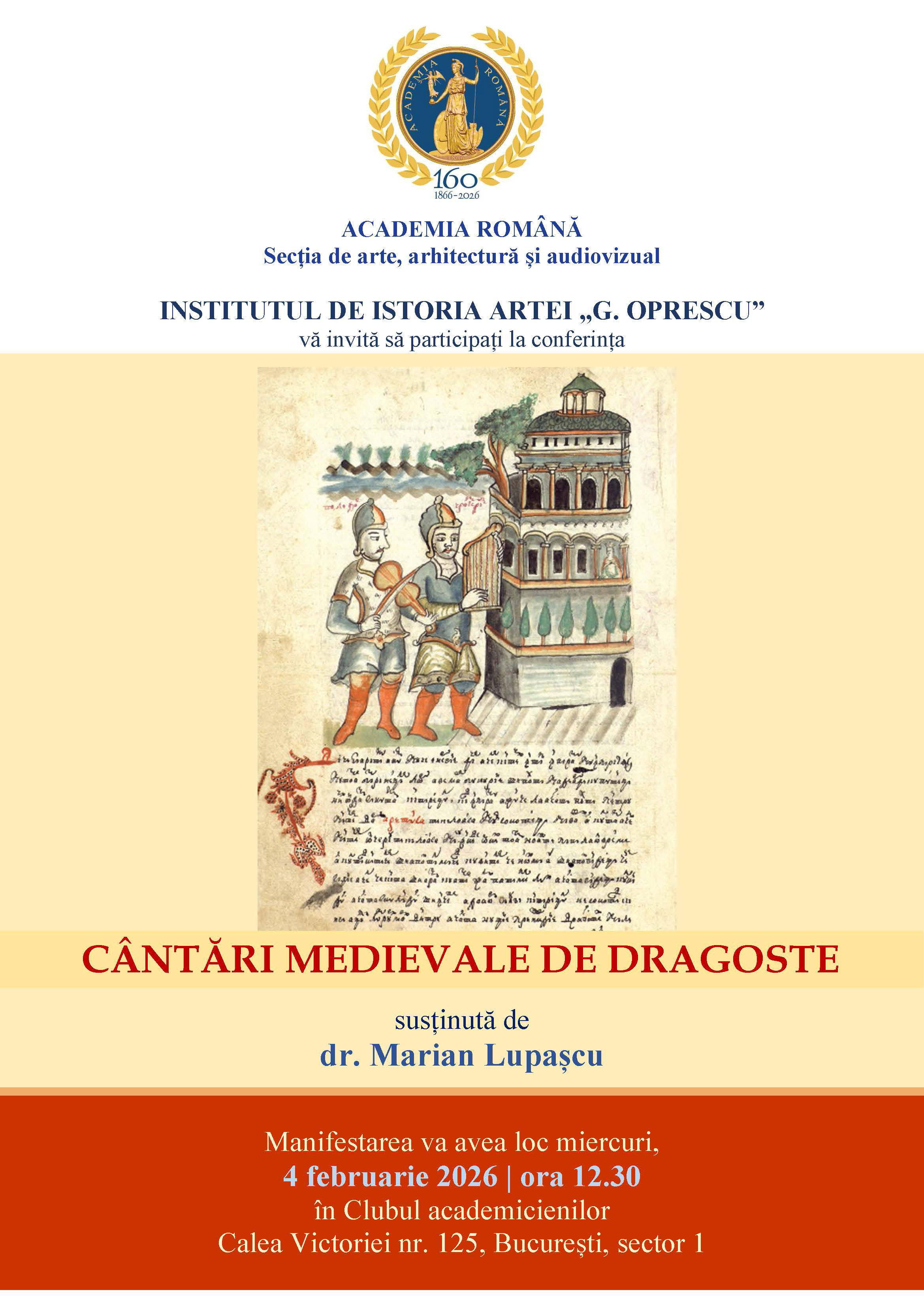 Institutul de Istoria Artei „George Oprescu” al Academiei Române organizează miercuri, 4 februarie 2026, conferința „Cântări medievale de dragoste” susținută de dr. Marian Lupașcu, cercetător al institutului. Evenimentul se va desfășura în Clubul academicienilor din Calea Victoriei nr. 125, începând cu ora 12.30.