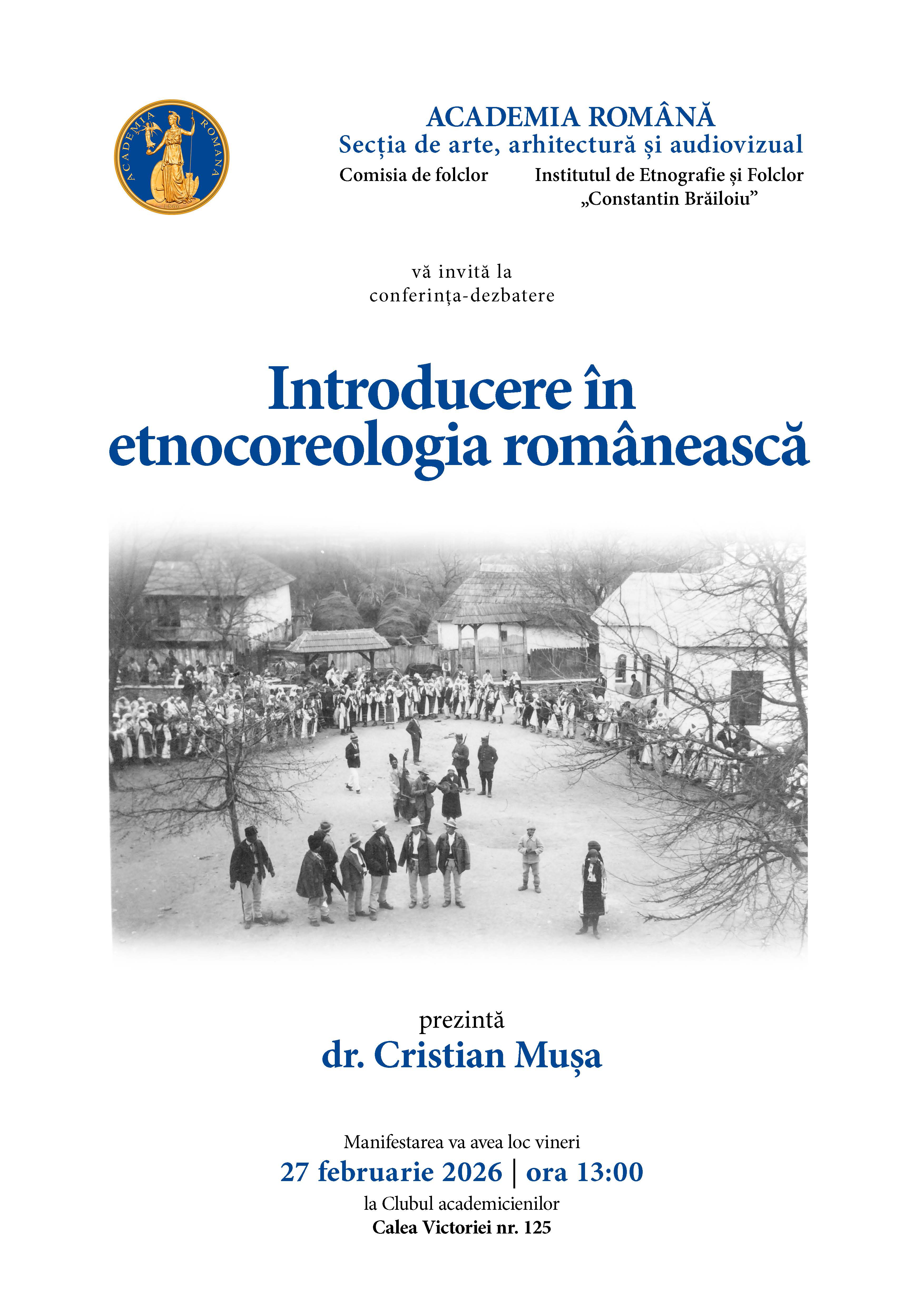 Institutul de Etnografie și Folclor „Constantin Brăiloiu” al Academiei Române organizează vineri, 27 februarie 2026, conferința-dezbatere „Introducere în etnocoreologia românească” susținută de dr. Cristian Mușa, cercetător științific al institutului. Evenimentul se va desfășura în Clubul academicienilor din Calea Victoriei nr. 125, începând cu ora 13.