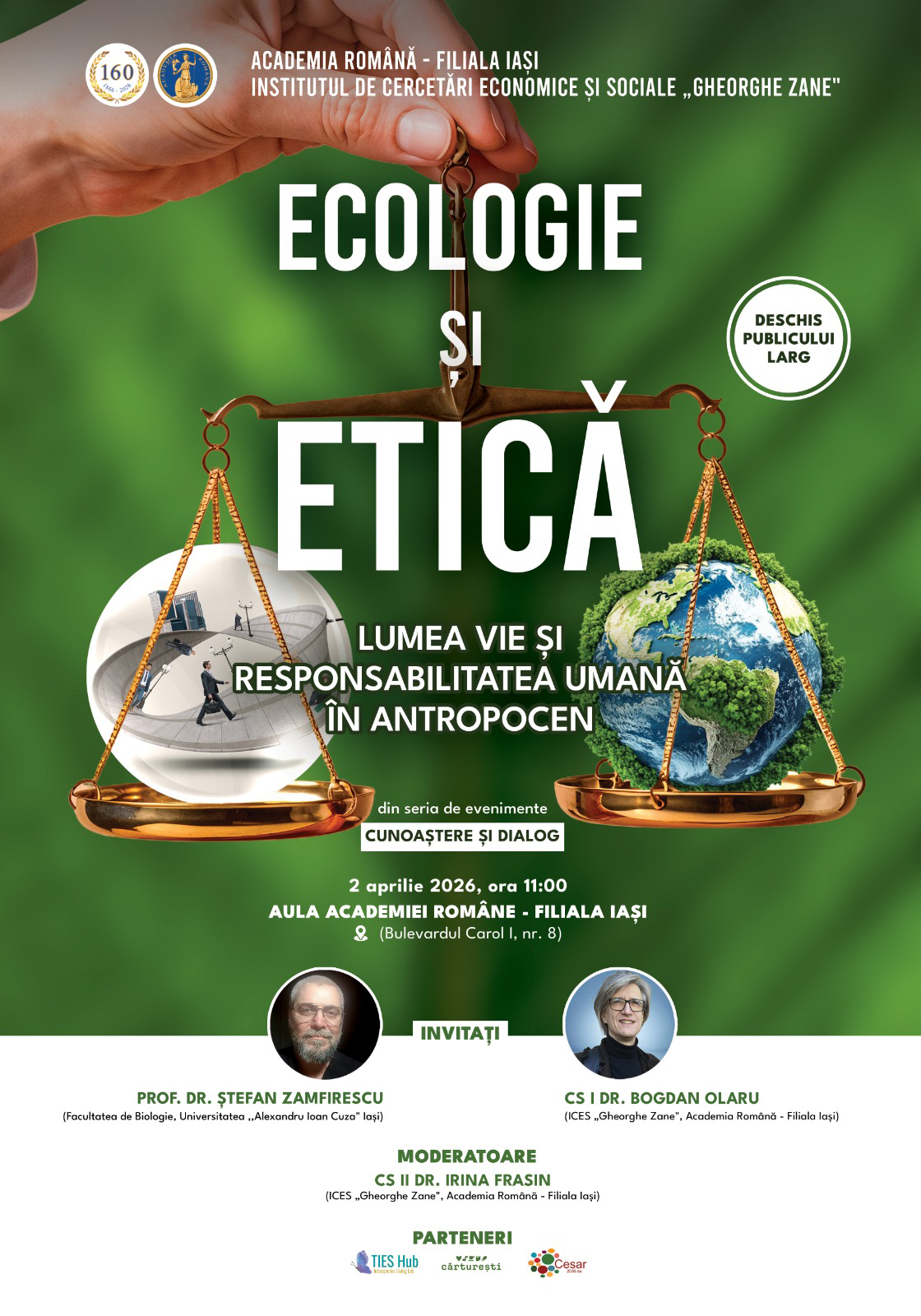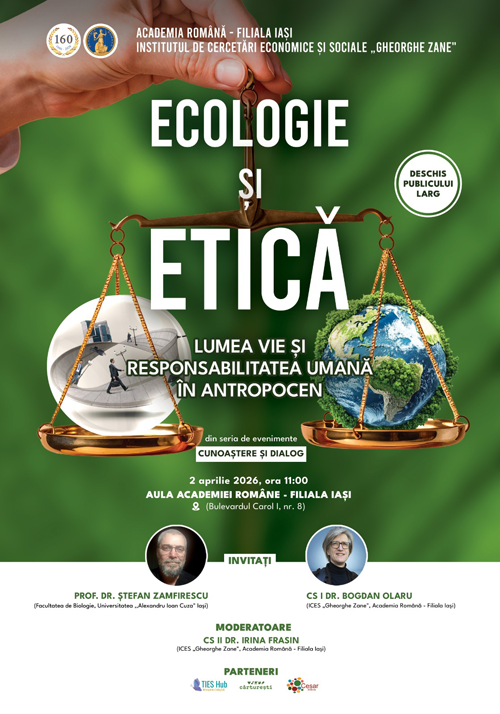 Institutul de Cercetări Economice și Sociale „Gheorghe Zane” organizează dezbaterea cu tema „Ecologie și etică. Lumea vie și responsabilitatea umană în Antropocen”. Manifestarea științifică se va desfășura în Aula Academiei Române – Filiala Iași, pe data de 2 aprilie 2026, ora 11.