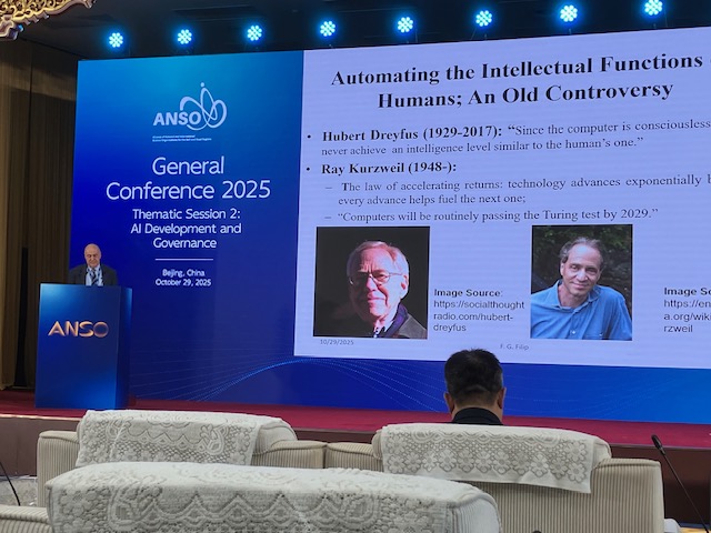 În cadrul Conferinței Generale a ANSO pentru Știință si Inovație, Sesiunea tematică nr. 2 intitulată „AI Development and Governance”, la care au participat cca 300 de delegați din cca 50 de ţări (foto 3), acad. Florin Gheorghe Filip a prezentat comunicarea keynote intitulată „Towards a Human Centered Artificial Intelligence Era: Evolutions, Evaluations, Governance, Prospects”, ȋn care au fost incluse elemente privind unele inițiative recente europene și naționale din domeniu (foto 4 și 5). Prezentarea a fost publicată ulterior pe site Research Gate și a primit DOI: 10.13140/RG.2.2.10945.62568.