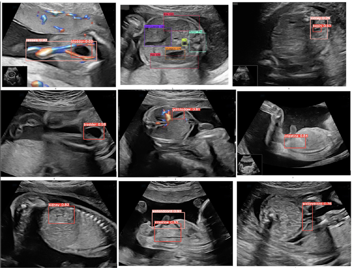 încadrată și etichetată cu probabilitatea asociată recunoașterii (ex. vezică urinară, rinichi, intestin, cordon ombilical).